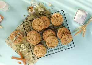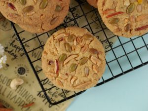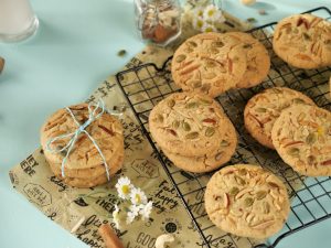 -Chota doigh lein (50g) aur ball bana ker gently press karein aur cookie ki shape bana lein phir cookie ki ek side ko mixed nuts ka upper press ker lein (makes 15).