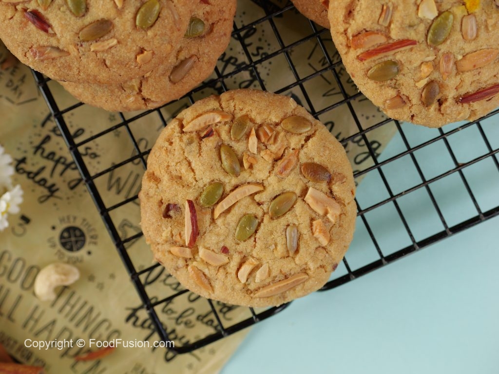 -Take a small dough (50g),make a ball & press gently to make a cookie shape & press the cookies on mixed nuts from one side (makes 15).