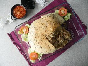 Fried pyaz dal ker dough ka edges ko fold ker ka oil sa grease ker lein aur baking tray (10x10 inches) per flip ker lein.
