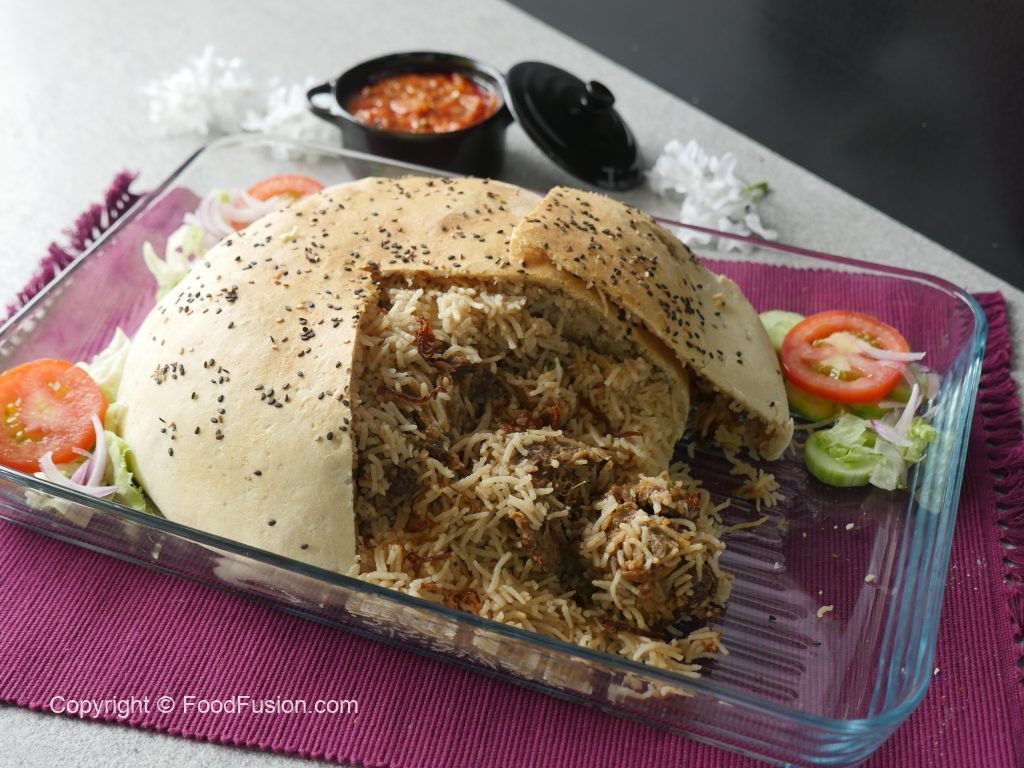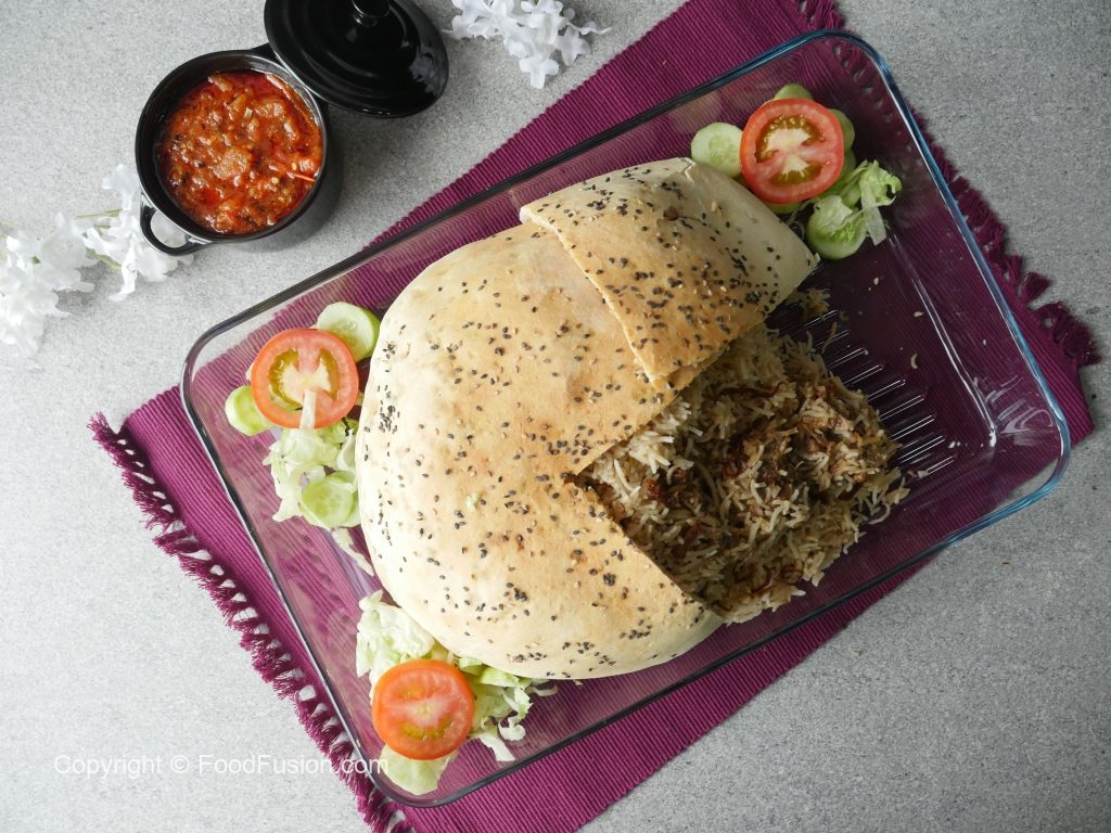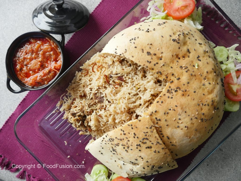 Cooked chawal,cooked meat,fried pyaz aur cooked chawal dal ker evenly pheela lein.