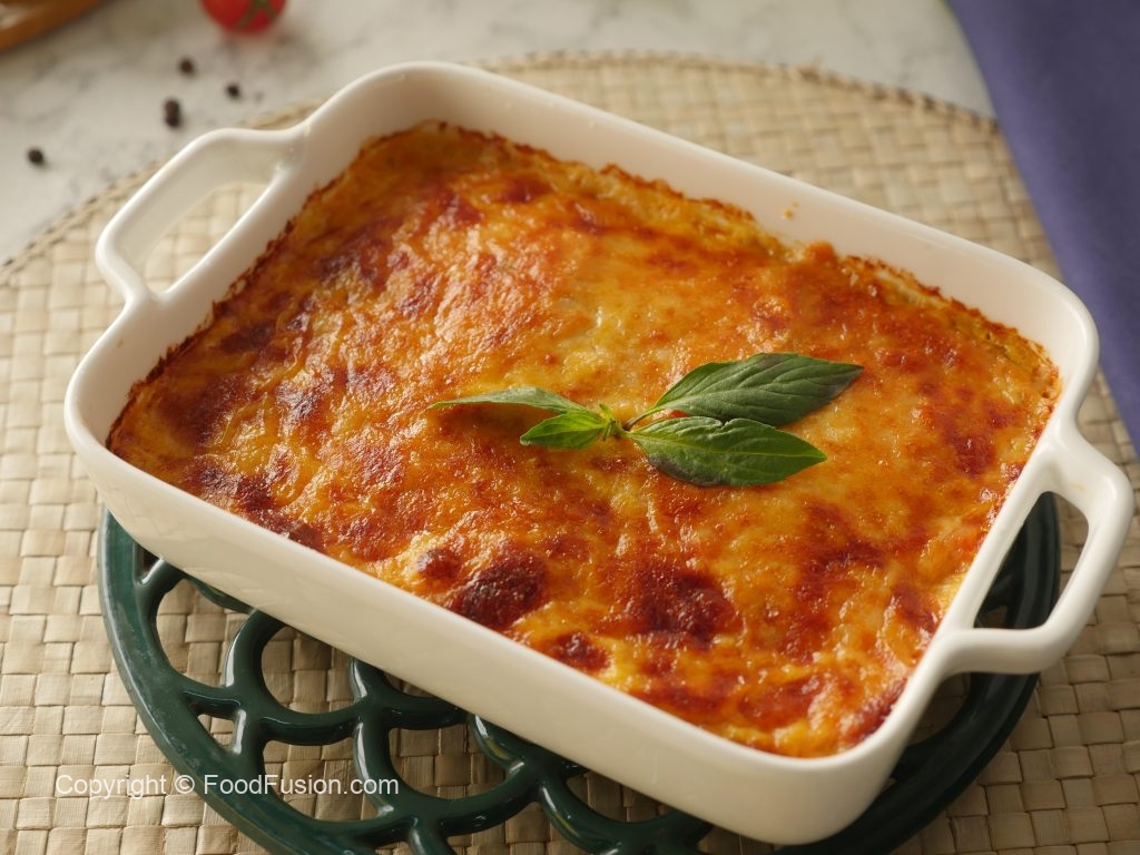 Baking dish mein tayyar tomato sauce,fried baingan slices,tayyar tomato sauce,mozzarella cheese, parmesan cheese,fresh basil leaves,fried baingan slices,prepared tomato sauce,mozzarella cheese aur parmesan cheese dal dein.