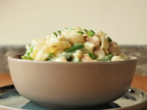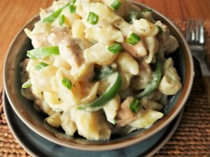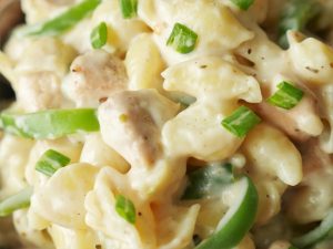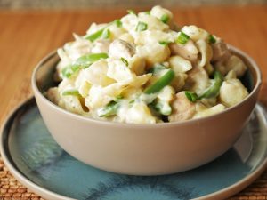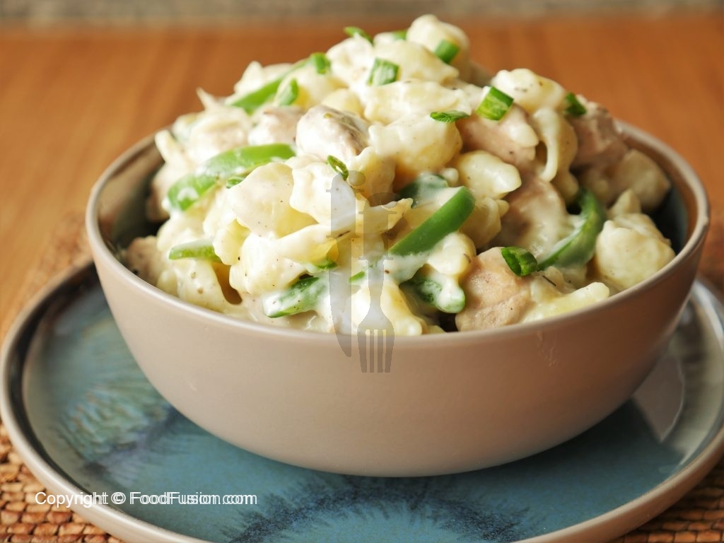 In white sauce,add stir-fried vegetables,cooked chicken,boiled shell pasta and give it a good mix.