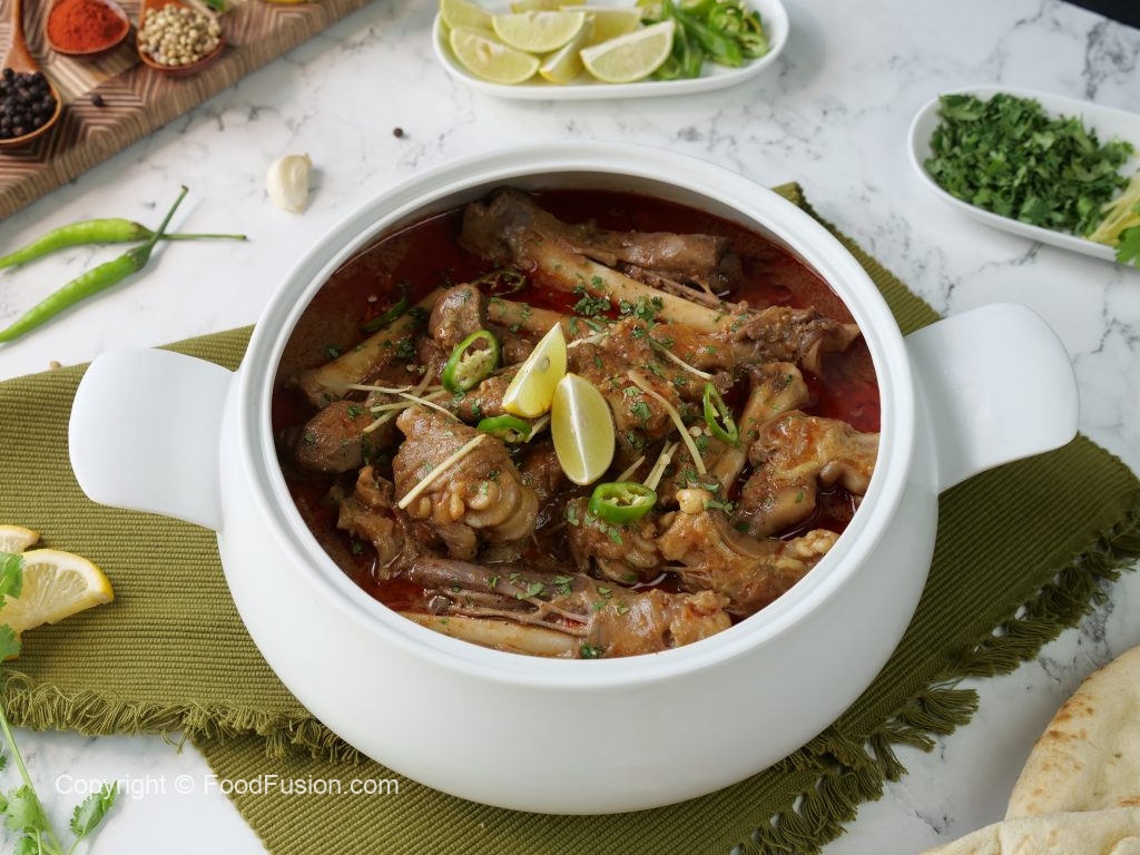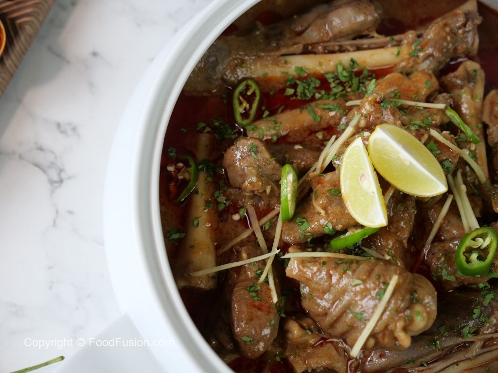 -Serving dish mein paya nihari aur tarri dal dein,hara dhania,adrak,hari mirchein aur lemon sa garish ker ka serve karein!