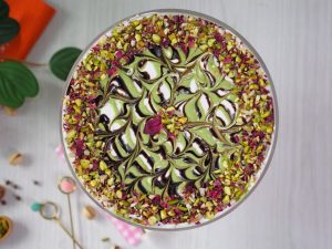 -Garnish with whipped cream,pistachio sauce,chocolate syrup & make a swirl design.