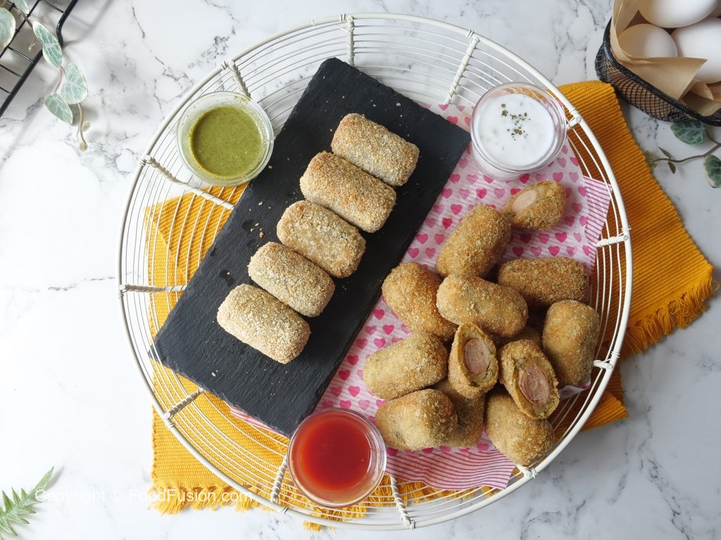 -Ab fried sausage rakh dein aur aloo mixture sa cover ker lein & ek jaisay sizes ka croquettes tayyar ker lein.
