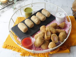 -Spray non-stick spray on croquettes & air fry at 180C for 10-12 minutes (flip in between once after 5-6 minutes).