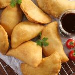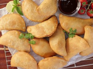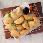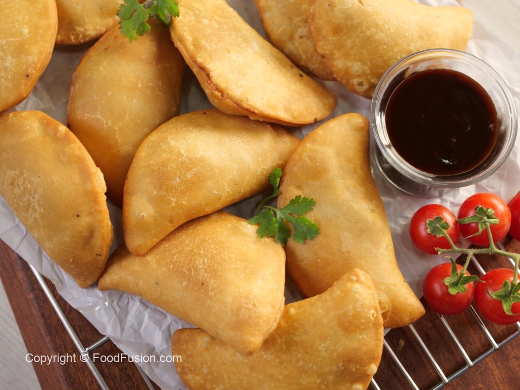 -Pani laga lein aur rolled dough ko filling ka upper dal dein phir round cutter ki madad sa half-moon cut ker lein & edges ko gently press ker ka seal ker lein.