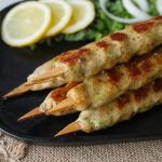 Dip hands in water & take a mixture (55g) and make kababs of equal sizes on wooden skewer (makes 14-15).