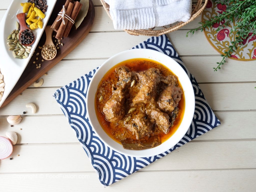 Dahi,adrak,lehsan,sabut kali mirch,javitri,hari elaichi,laung,darchini,tez patta,zeera,lal mirch powder, haldi powder,namak,fried pyaz (haath sa crush ker lein) ar kaju paste dal ker ache tarhan mix ker lein.