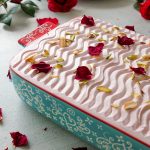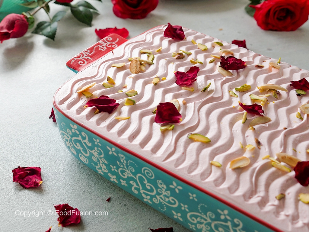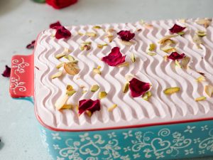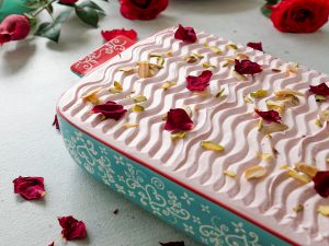 Takeout from the refrigerator, apply rose frosting & garnish with pistachio, almonds, and dried rose petals.