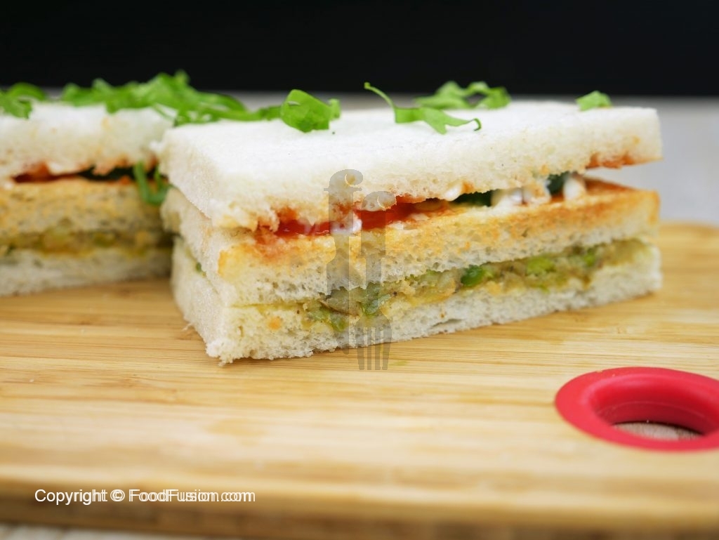 On bread slice,spread butter then add and spread potato & peas mixture and top with bread slice.
