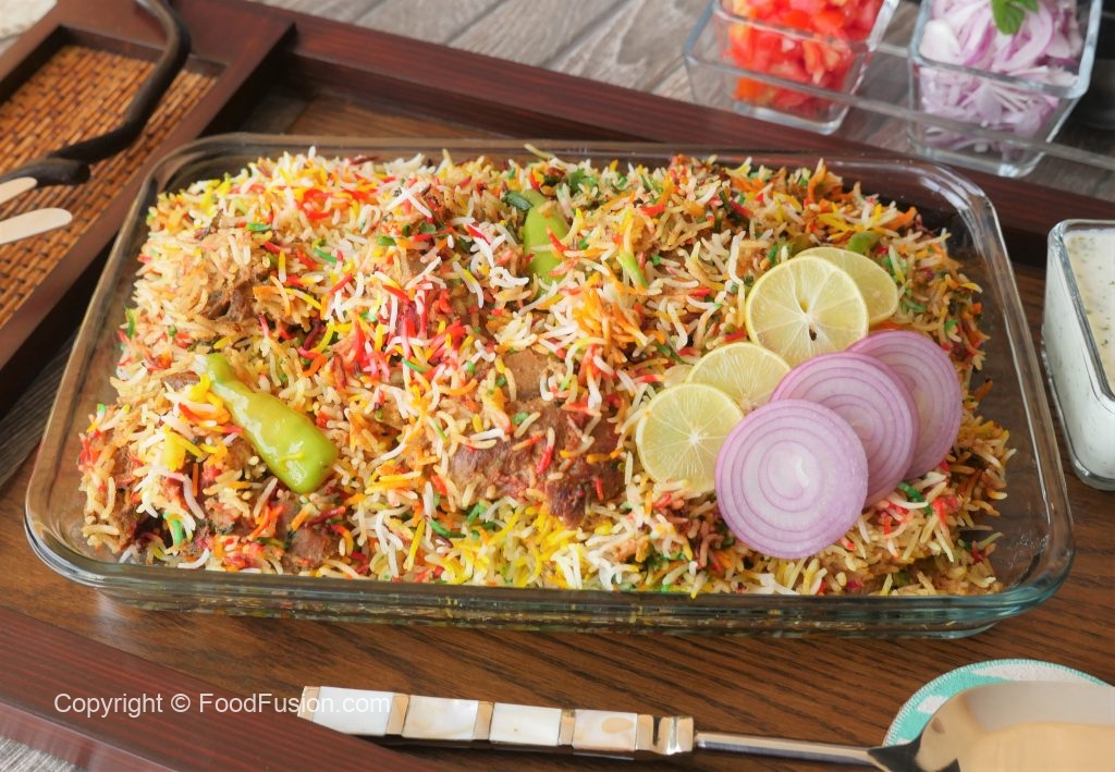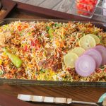 Spread dissolved red food color,green food color,orange food color & yellow food color,mint leaves, fresh coriander,fried onion,cover & steam cook on low flame for 18-20 minutes.