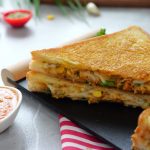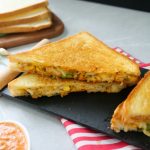 -Flip the prepared sandwich in a frying pan (butter side down),apply butter,cover & grill/cook on very low flame from both sides until golden & crispy (makes 4 sandwiches).