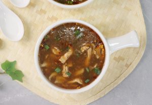 -Serving bowl mein lal mirch crushed,soy sauce,til ka tel,soup aur hara pyaz leaves dal ker serve karein!