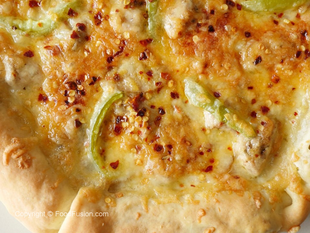 Add mozzarella cheese,cooked chicken,mushrooms,onion,red chili crushed,cheddar cheese,capsicum, mozzarella cheese and sprinkle red chili crushed (makes 2 large pizza).