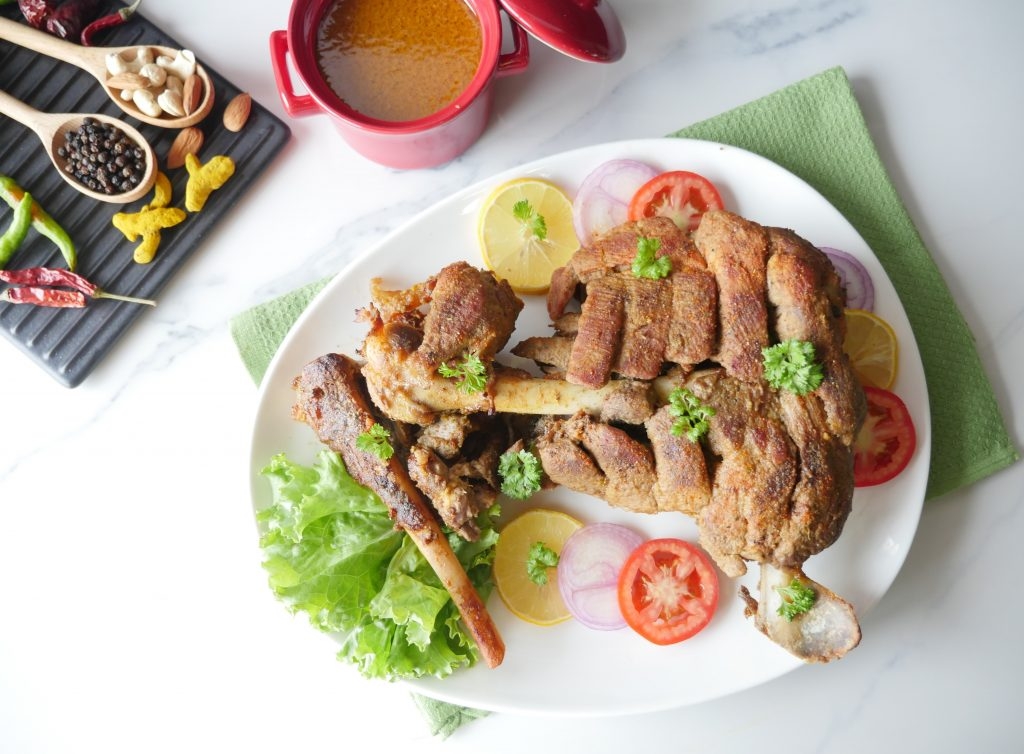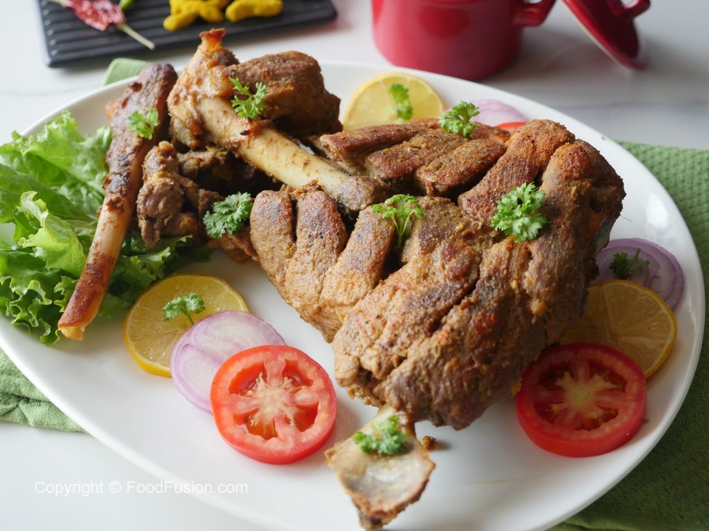 Baking tray per aluminum foil aur butter paper laga ker marinated mutton leg rakh ker marinade dal dein aur foil ko properly seal ker lein.