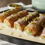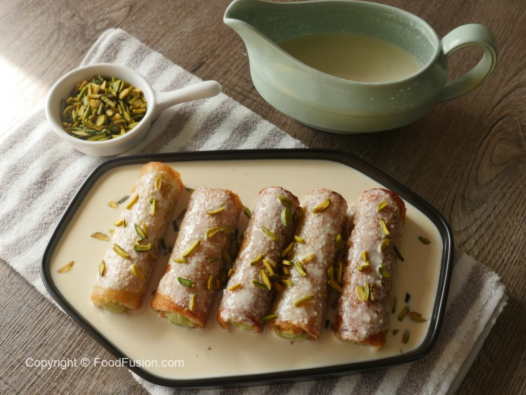 Serving dish mein bread rolls ups rakh dein aur neem garam doodh dal dein.