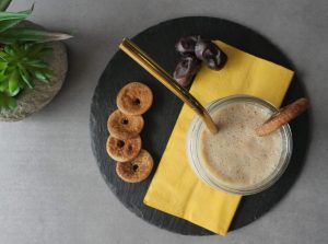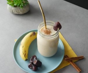In blender jar,add dates (deseeded),banana,yogurt,milk,cinnamon powder,ice cubes and blend until well combined.