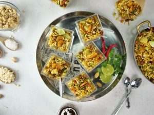 -Take out in a bowl,add mixed nimco,onion,tomato,potatoes,cucumber,black chickpeas,split bengal gram,crushed mixed pickle,green chillies,ginger,black salt,chaat masala,citric acid,fresh coriander,lemon juice,1-2 tbs of prepared imli ki meethi chutney,1-2 tbs of prepared green chutney & mix well.