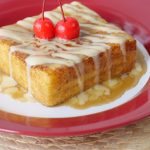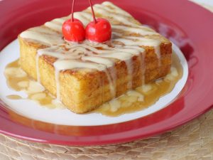 -On french toast,drizzle vanilla cream sauce,pancake syrup,garnish with cherries & serve!