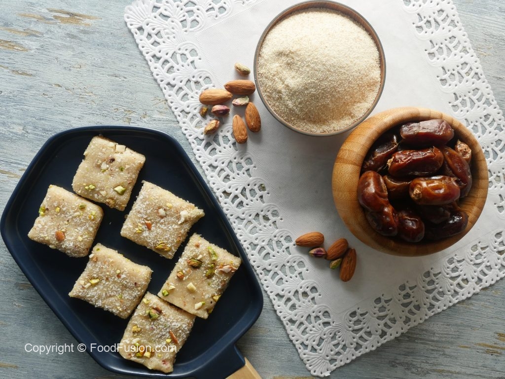 Ab isko greased tray main set karlen aur 1 hour rest kar len phir uper khopra, pista aur badaam sprinkle karke squares cut kar len.