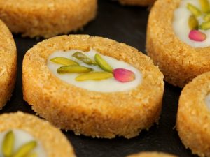 -Add sugar,poppy seeds,desiccated coconut,cardamom powder,baking soda,pink salt,clarified butter, kewra essence & mix well.