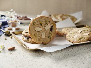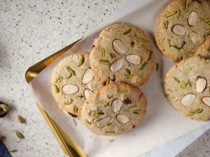 -Place it on a smooth surface,press gently,add almonds,pistachios & poppy seeds,cover with butter paper & press gently to spread it.