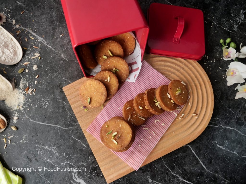 In a bowl,add all-purpose flour,semolina,sugar,sesame seeds,desiccated coconut,cardamom powder and mix well.