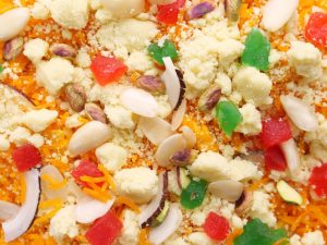 -Garnish with khoya,tutti fruiti,almonds,pistachios,dried coconut,cham cham & serve!