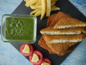 Now coat marinated fish fillets into breadcrumbs then dip into beaten eggs and again coat in breadcrumbs and shape into square shape.