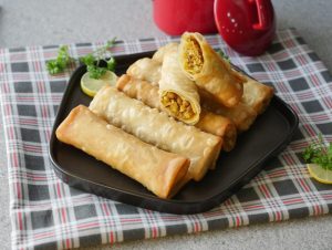 Samosa sheet/manda patti lein aur tayyar filling dal ker tamam sides ko fold ker ka roll ker lein aur maida ka paste laga lein.