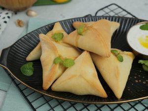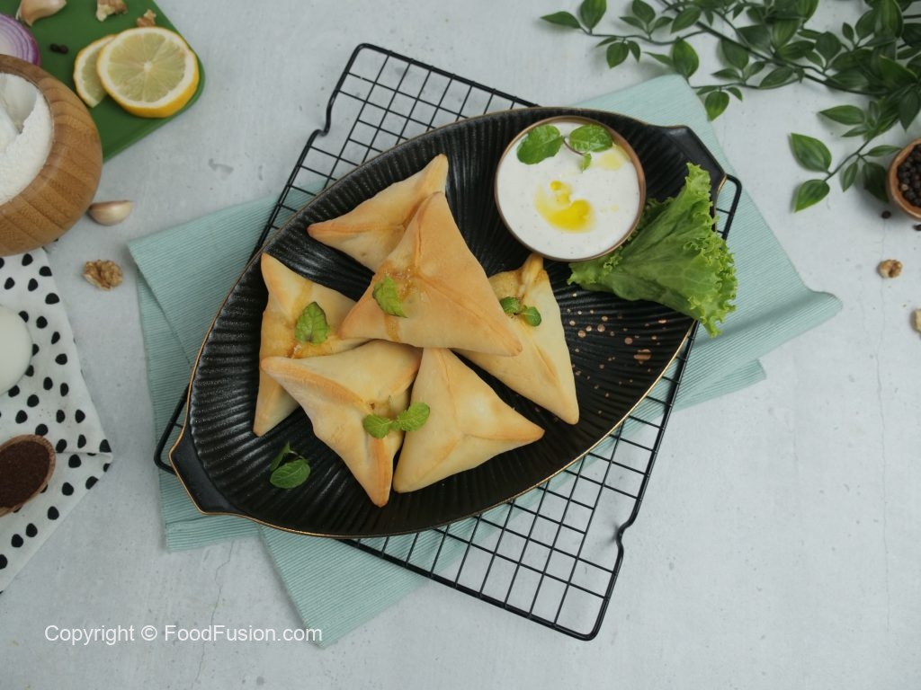 -Chota rolled dough lein,1 tbs spinach & walnut filling aur feta cheese dal dein aur edges per pani laga lein.