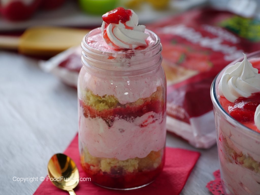 Enjoy this strawberry Angle Fruit Cake Dessert this weekend. Thanks to Fauji Fresh n Freeze we can now enjoy good quality fruits even off season. #FaujiFreshnFreeze #FreshnFreeze #HappyCookingToYou #FoodFusion