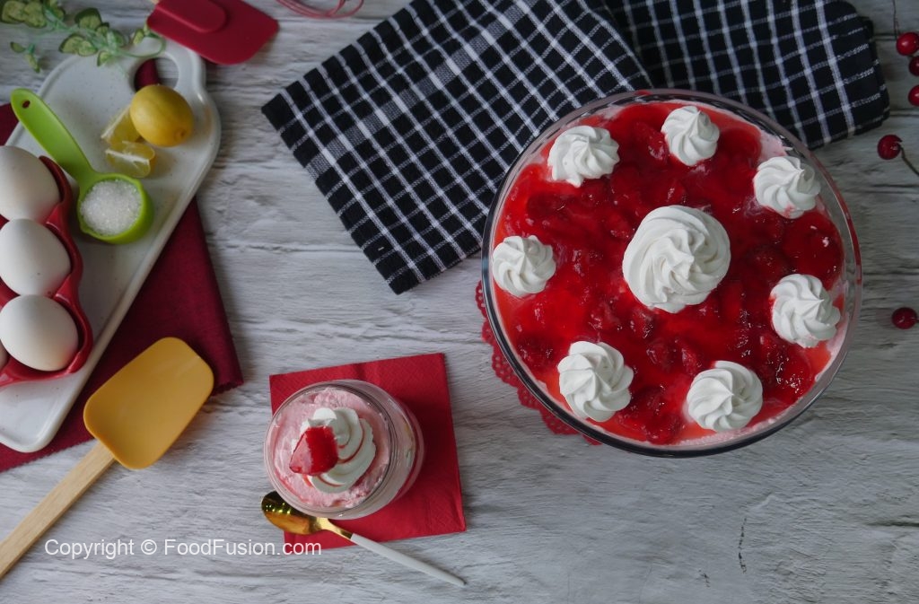 In whipped cream,add prepared strawberry jello (reserve ½ cup of jello for later use) and mix well with the help of spatula & refrigerate until use.
