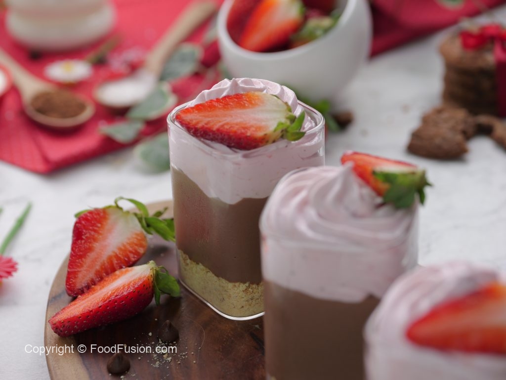 -Serving glass mein crushed biscuits,tayyar chocolate pudding & strawberry cream dal dein.