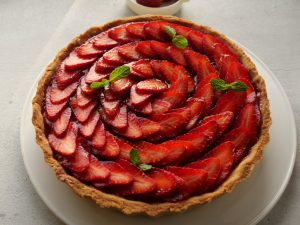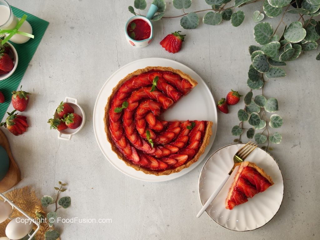 -Tart base per tayyar custard dal ker pheela lein aur 10 minutes kliya refrigerate ker lein.