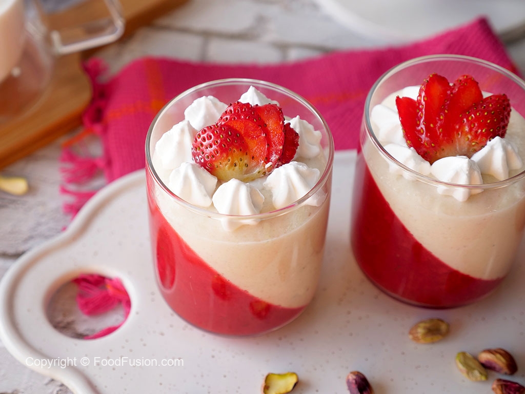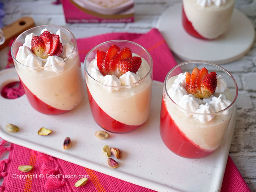 In serving glass,add prepared pistachio kheer enough to cover strawberry jelly and garnish with whipped cream & strawberry slices.