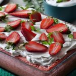 Add prepared frosting over the cake & spread with spatula. Decorate the cake with strawberries then cut & serve!
