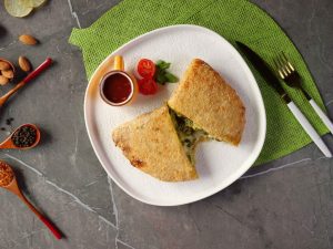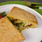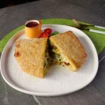 -Add prepared pesto & spread on half side,add mozzarella cheese,baby spinach,sun-dried tomatoes, fold,seal properly & coat with breadcrumbs.