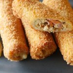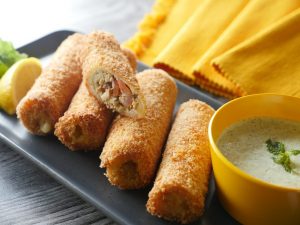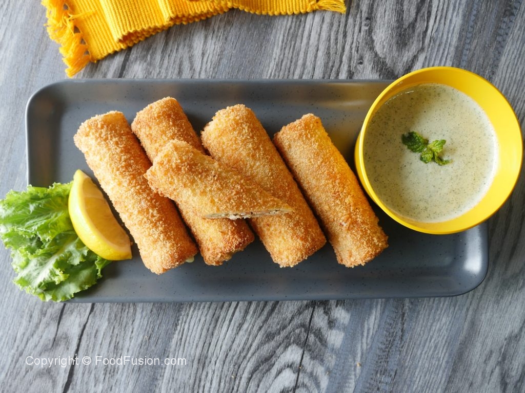 In frying pan,heat cooking oil and fry bread roll ups until golden brown.