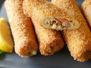 Dip bread roll ups into beaten eggs then coat in breadcrumbs.