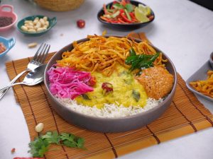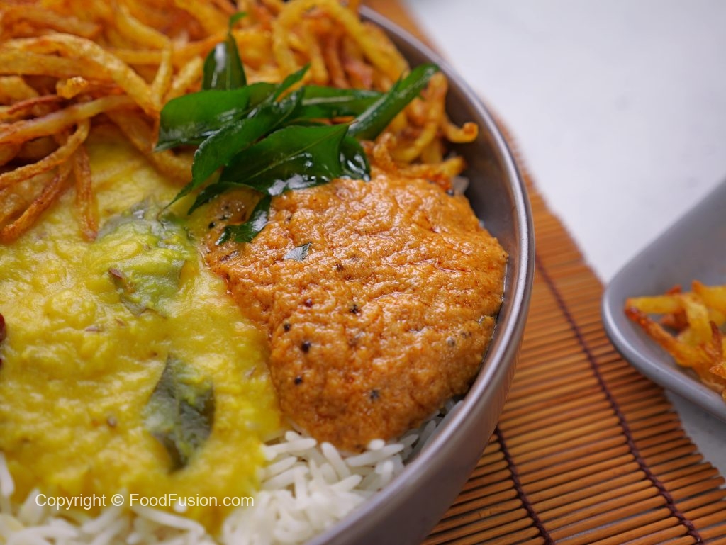 -Serving bowl mein rice, daal, crispy aloo, prepared teekhi chutney, pickle onion aur fried curry leaves dal kar serve karen.