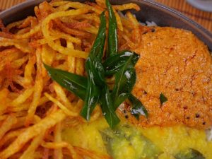 -In a serving bowl,add rice,daal,crispy aloo,prepared teekhi chutney,pickle onion,fried curry leaves & serve!