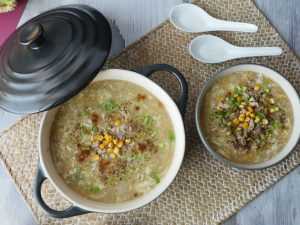 -In a serving bowl,add cooked chicken,fresh coriander,fried rice,prepared clear soup,fried garlic,pickled green chilli & serve hot!