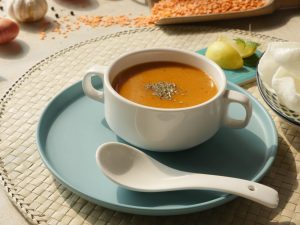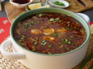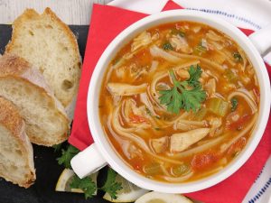-Take out chicken pieces,shred the chicken from bones & cut fillet into thin pieces then strain the soup & set aside.