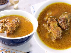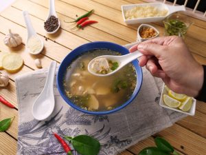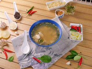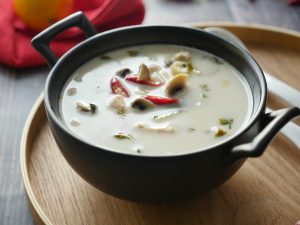 -Add lemon grass,ginger,onion,kaffir lime leaves,fresh coriander,pink salt,sugar,soy sauce,lemon juice,fish sauce,thai red chillies,chicken stock cube,cover partially & simmer cook on low flame for 25-30 minutes.