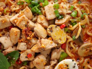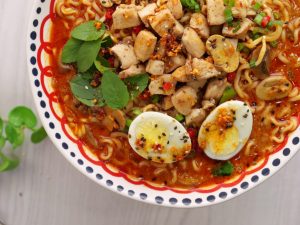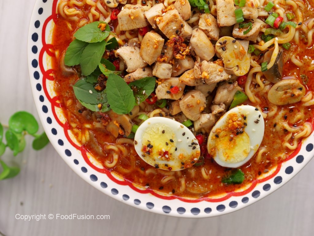 -Add cooked chicken,spring onion,thai red chilli,fresh basil leaves,boiled egg,chilli oil,sesame seeds & serve!