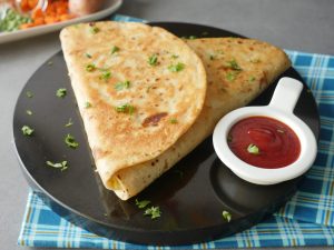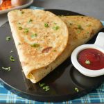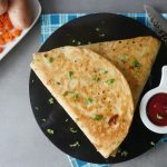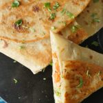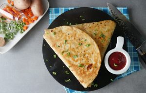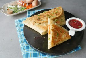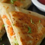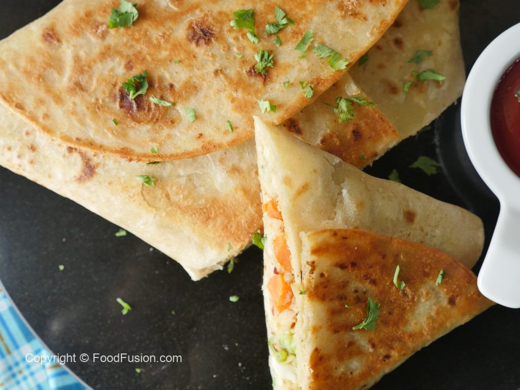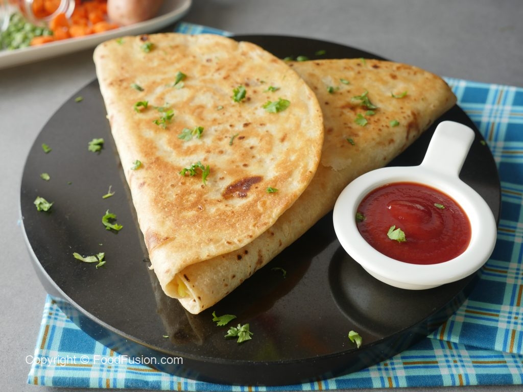 Add vegetable filling and fold tortillas/roti to make a triangle and seal with the help of potato filling (makes 2).
