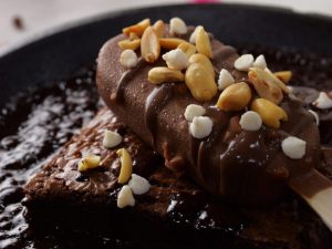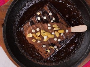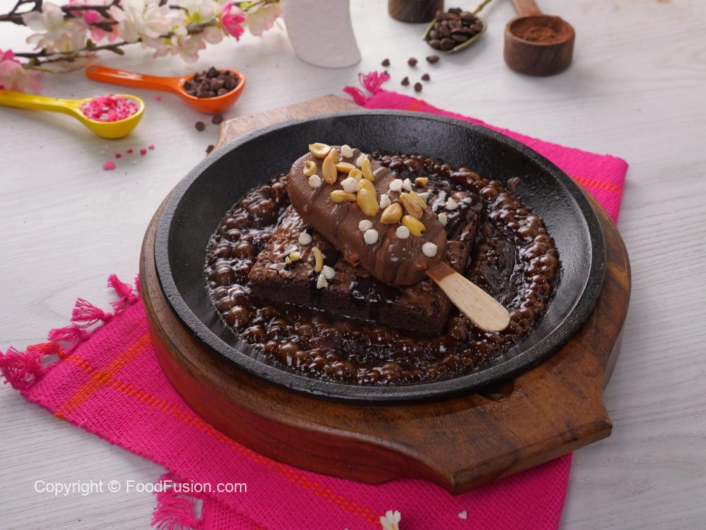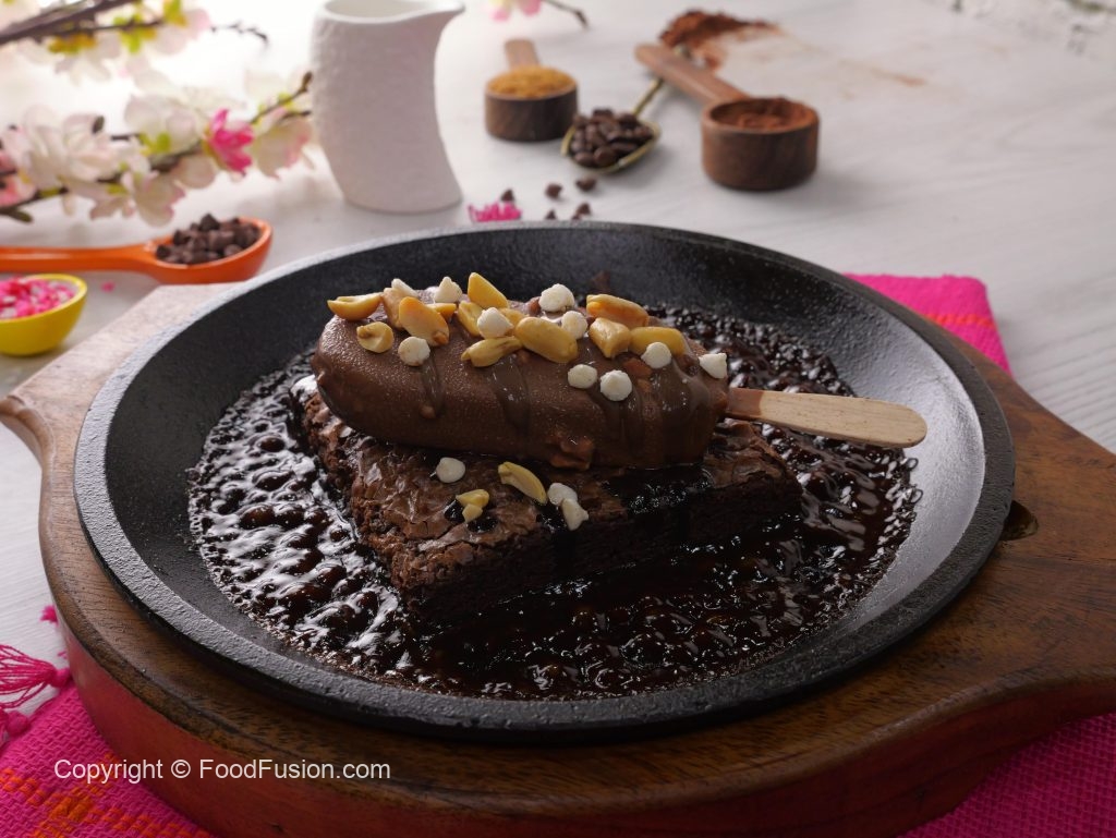 -In a hot sizzling pan,add chocolate brownie,pour chocolate sauce,add vanilla & hazelnut,drizzle chocolate sauce,sprinkle peanuts,white chocolate chips & serve!