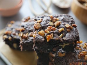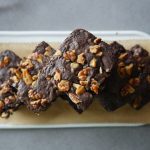 Pour brownie batter in prepared baking dish and add reserved cooking chocolate chunks (100g) & walnuts.